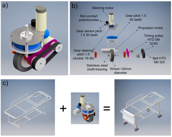 (a) Swerve drive module; (b) Exploded view of the swerve drive module showing its major parts; and (c) Concept of the modification of usual hospital beds into motorized ones by adding the swerve drive module.