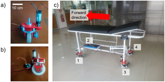 The results of the fabricated prototype of the swerve drive module are shown in Figure 3a. In addition, Figure 3b shows a photo of the whole system when four modules were installed on the frame of a commercial hospital bed. The forward direction is shown by the arrow, and each motor is numbered according to the photo for the performance evaluation.