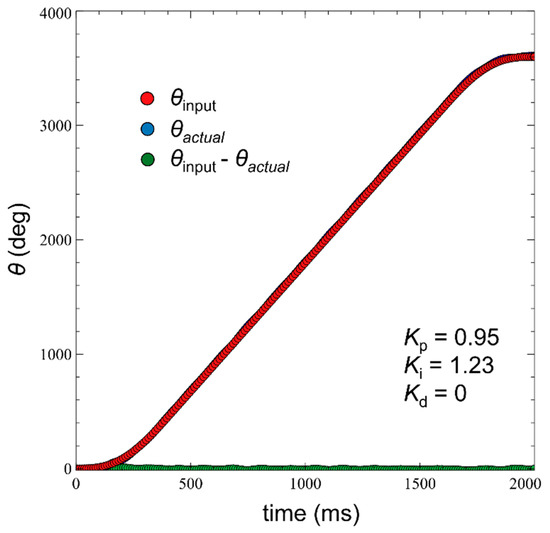 The DC motor for propulsion has an encoder that generates seven pulses per revolution. The motor and encoder were connected via a gearbox with a gear ratio of 1 (motor):19.2 (encoder). To obtain the revolution of the motor, the quadrature encoder method was utilized. A single revolution corresponded to 537.6 pulses, and it was converted to 360 degrees/537.6 pulses. PID tuning was conducted on the trajectory outputs of the quintic polynomial. The sampling rate for trajectory planning and PID control was 5 ms. After a series of trials and errors, the coefficient values of Kp = 0.95 and Ki = 1.23 were set, which resulted in satisfactory results with a substantially small error (difference between θinput and θactual), as shown in Figure 4.