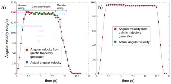 To assess the performance of the system, the velocity responses of the propulsion motor were measured and then compared with the values generated by the quintic trajectory generator. Two different conditions were considered: no load, as shown in Figure 5a, and with load, as shown in Figure 5b. The former was achieved by turning the prototype upside down such that the wheels rotated without friction to the surfaces. However, the latter refers to the condition of the prototype receiving load from its own weight while making a forward motion at a constant velocity. For this particular performance evaluation, only data from motor no. 1 (refer to Figure 3b) were shown. During the data collection for both conditions, the swerve drive module was subjected to three different motion phases, as depicted by the shapes of the graphs (also indicated in Figure 5b), i.e., accelerating, constant velocity, and decelerating.
