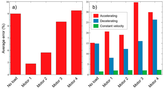 From Figure 5, it can be inferred that the developed control system performed well. However, further assessment is necessary, especially to quantify the errors and evaluate them for each motor under different motion types. Therefore, the same experiments were conducted again, and data were rearranged to show the error values, defined as the summation of the differences between the angular velocities obtained from the quintic trajectory generator and the actual values for each sampling time during a single experimental run. Figure 6a depicts a comparison of the average errors for the conditions of no load and with load for motors 1–4. In this graph, the values include all the motion phases of accelerating, decelerating, and constant velocity. Therefore, in Figure 6b, a breakdown of the errors based on the motion type is shown.