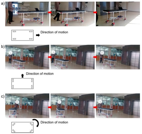 Finally, a demonstration was conducted to qualitatively assess the performance of the prototype. Besides performing a straight-path motion test, whose video snapshots are shown in Figure 7a, the prototype was tested for its holonomic motion by demonstrating a right-angle turn (Figure 7b) and a circular motion (Figure 7c). The complete video can be accessed as a Supplementary Materials on the publisher’s site. Based on the performed tests, as shown in Figure 7b,c, the holonomic mobility of the prototype was qualitatively justified, though further evaluation is necessary, especially in quantitative terms.
