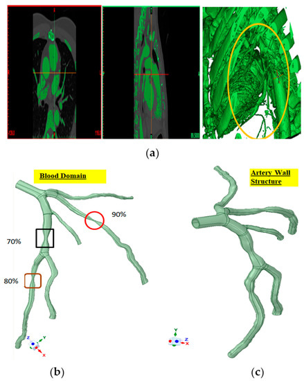The multiple stenoses were conceived as the main objective of the present study. MIMICS 18 software used to export the CT scan images obtained from the patient. The left coronary artery model reconstructed was accomplished by identifying appropriate thresholds ranging from 84 to 630 HU. The left coronary artery was positioned, and the segmentation procedure was performed as shown in Figure 1a.