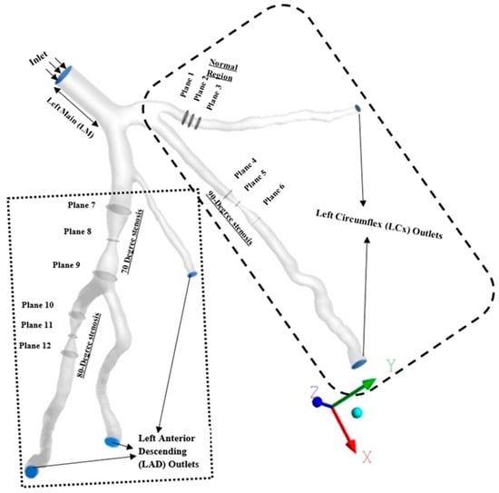Employing computational fluid dynamics (CFD) together with medical imaging techniques, such as, magnetic resonance imaging (MRI), computed tomography (CT), and echocardiography has become an efficient tool in the recent past, to investigate the hemodynamics within multiple stenosed coronary arteries [8]. Moreover, earlier studies claimed that blood flow, especially in stenosed arteries, cannot be considered a single-phase homogeneous viscous fluid [7,9,10] and instead employs a multiphase model. The more realistic multiphase model provides more information, such as, RBC volume fraction (VF), RBC velocity, viscosity of RBC and plasma [11]. Fewer studies incorporating a multiphase model while considering a real geometry model from an 8-year-old female patient with a moderate coarctation of aorta (CoA) [12], idealized geometric arteries [13,14,15] and pulsatile blood flow in coronary arteries [11,16] have been reported. Additionally, the mechanism of atherogenic disease progression is somewhat complex, so the hemodynamic indicators arising from multiphase modelling serve as bio markers for healthcare providers [17]. Researchers have reported for ideal as well as patient-specific models that the regional wall shear stress (WSS) and oscillatory shear index (OSI) play a critical and fundamental role in the progression of atherosclerosis [14,18,19]. These indicators are significantly linked to the prediction or development of atherosclerosis in arteries as they tend to alter; the structure of endothelial cell layer in the surrounding tissues, and the relationship between biomechanical stresses or deformation [20,21]. In a flexible artery, exhibiting single and double stenoses [22], showed that laminar flow occurs for a 70% stenosis while, the flow becomes turbulent for 80% occlusion. Additionally, dilation in the arterial walls in double stenoses was found to be more common than in single stenosis. This in turn, caused a suppression in the maximum mean WSS value in a double stenosis, compared to single stenosis. More details of CFD fluid–solid interaction (FSI) studies are available in the literature [19,20,21,23,24,25,26], respectively. Furthermore, an atherosclerotic condition develops near bifurcations as well as areas of highest curvature in the arteries, as they result in blockage of blood supply in the myocardium [23,27]. However, there are no studies conducted using multiphase blood flow incorporating fluid–solid interactions in a patient-specific left coronary artery (LCA).