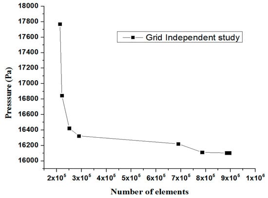 Furthermore, the mesh was refined by adding the inflation layers across the interface between the fluid and structural domains to obtain more precise results in areas near the artery walls. An independent grid study was also performed, as described in Figure 5. The simulations were started while considering 213,195 elements, these grids were then successively increased until the independence was achieved at 884,725 elements. The pressure value stabilized beyond the chosen grid.
