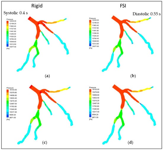 Figure 6 shows the comparison of the wall pressure between the rigid and FSI model of the left coronary artery at systolic and diastolic phase of the cardiac cycle. The pressure drop was maximum across the 90% area stenosis as compared to other regions of stenosis. The maximum pressure drop was found as 100,077 Pa for both the rigid and FSI models, whereas a slight difference in wall pressure was noted across the bifurcation in both the models. The pressure drop across the 70% and 80% area stenosis were 11,727 Pa and 10,784 Pa, respectively. Similarly, the wall pressure for the CFD and FSI models of the left coronary artery was plotted for the diastolic phase of the cardiac cycle. It can be seen clearly that the wall pressure drop was maximum across the 90% area stenosis present at the LCX branch as compared to 70% and 80% at the LAD branch. It was found that the pressure drops to 8871 Pa across 90% of the area of stenosis for the diastolic phase of the cardiac cycle for both the models. A slight variation across the bifurcation regions was observed in wall pressure between the rigid and FSI models.