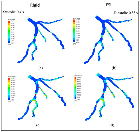 Wall shear stress field in the left coronary artery during the systolic and diastolic phase of cardiac cycle for (a,c) rigid and (b,d) fluid–solid interaction (FSI) models.