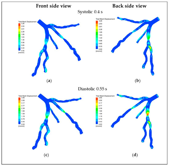 Figure 8 represents the wall displacement contours due to the pressure on the wall in the whole left coronary artery within the FSI model during the systolic and diastolic phases of the cardiac cycle.