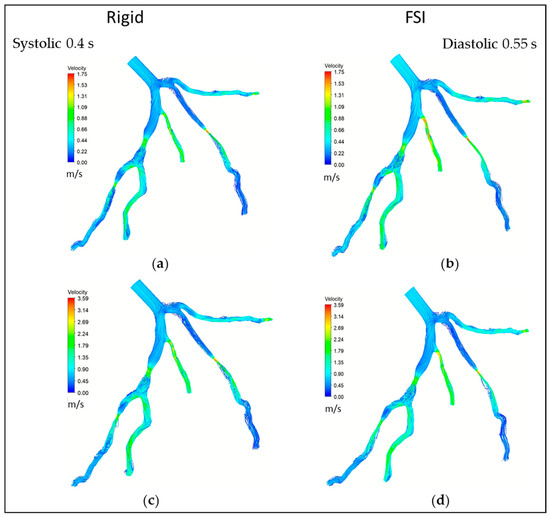 Velocity streamlines of the blood flow field in the left coronary artery (LCA) during the systolic and diastolic phase of cardiac cycle for (a,c) rigid and (b,d) FSI models.