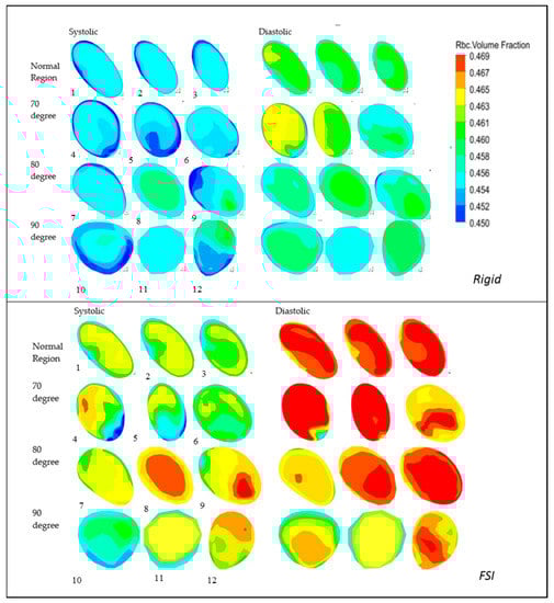 The two-phase mixture theory model of RBCs and plasma was primarily simulated with 45% hematocrit concentration. The volumetric fraction counters of RBC for the rigid (top) and FSI (bottom) models during the systolic and diastolic phase of the cardiac cycle is shown in Figure 10 on planes 1–12 revealed in Figure 3. The cross-section plans across the normal, pre, mid, and post stenosis for 70%, 80%, and 90% of the area of stenosis were plotted. It was determined that the volume fraction of RBC increases across the stenosis region for the peak diastolic as compared to the systolic phase of the cardiac cycle. The volume fraction of RBCs reduces as the velocity was found to increase at the pre stenosis region compared to the mid and post stenosis region. The wall shear stress across the stenosis region was increased significantly with increases in the RBCs volume fraction which can be observed in Figure 10 for both the rigid and FSI models.