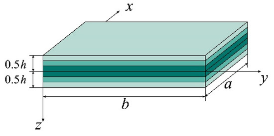 Consider an FG-GRC plate with length a, width b, and thickness h (Figure 1) using the cartesian coordinate system x, y, z, with plane z = 0, coinciding with the midplane of the plate. is the total number of layers of FG-GRC plates, and it is worth noting that this paper is only for FG-GRC plates with an even number of layers. GPLs are used as fillers and four distribution patterns proposed by Song et al. [12,43] are used in this paper. In Figure 2, taking the plate with as an example, a schematic diagram of the four distribution modes of GPLs is given [12,43].