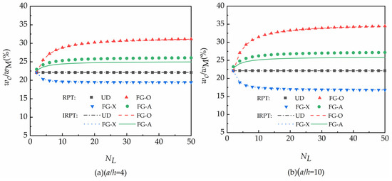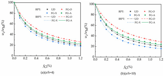 It can be clearly seen that when the GPLs are asymmetrically distributed (FG-A), the difference between the results obtained from the two plate theories (RPT and IRPT) is very obvious. When the GPLs are symmetrically distributed within the FG-GRC plates (UD, FG-O, and FG-X), the difference between the results calculated by the two plate theories is very small. This is due to the asymmetric distribution of GPLs in the transverse thickness direction, resulting in a more significant transverse anisotropy in FG-A-type FG-GRC plates. That is to say, the more significant transverse anisotropy of the FG-A-type FG-GRC plates compared to the symmetrically distributed modes of GPLs leads to a significant difference in its deflection ratio in the calculated results of RPT and IRPT, and this difference is evident in both thick plates with and moderately thick plates with .