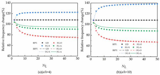 The effects of the total number of layers and the weight fraction of GPLs on the fundamental frequency change in FG-GRC square plates at and are given in Figure 5 and Figure 6, respectively. The relative frequency change is equal to . Figure 5 is calculated by taking and Figure 6 is calculated by taking . All four distribution modes of the FG-GRC plate were considered and the results of the RPT and IRPT calculations are compared in Figure 5 and Figure 6.