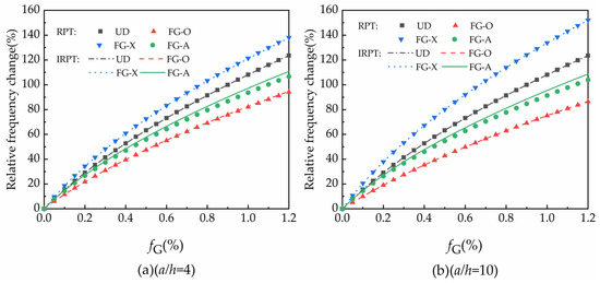 The dimensionless natural frequencies and relative frequency increase of FG-GRC plates are given in Table 4. Each distribution mode of the FG-GRC square plates was calculated. The results of the calculations for the pure epoxy plates are also included in Table 4. The dimensionless natural frequencies and relative frequency increases in RPT and IRPT were compared. The role played by the effect of thickness stretching in the free vibration process of FG-GRC plates can be seen by comparing the results of RPT and IRPT calculations.