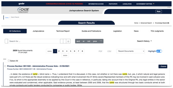 Figure 1 shows an example of a search using the developed system. Collections can perform the search in the system’s database, i.e., judgments from the Federal Audit Court, guides and publications, jurisprudence, legislation, news, and technical opinions, selected according to the end user’s needs. The search results show all documents with the word searched in highlight (“Cartel”). In addition, the company names returned after the search was protected and named with <blind name>. The system returns ten search results per page, and for each of them, we have the options of process data, related documents, summaries (summary of a decision), verbatim (sequence of key words, or expressions indicating the subject discussed in the text), device (rule resulting from the judgment), and conclusion (final decision), depending on the document type searched and the collection it belongs. Moreover, the user can add the search to a knowledge basket, available for future searches. Algorithm 1 presents the code for this search.