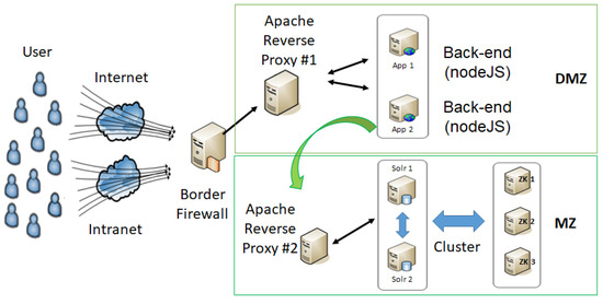 The proposed architecture (Figure 2) has public and private access to the client interface code domain held in a demilitarized zone (DMZ) but with security guarantees (HTTPS, attack treatment, and others.) performed by an edge firewall. In this context, to ensure high availability in the access to the client interface codes, there is an Apache Reverse Proxy (#1) acting after the edge firewall that filters the results and, mainly, performs the load balancing between the two servers that provide high availability (fault tolerance and round-robin load balancing). It is important to emphasize that the data domain and the properly authenticated Solr search APIs run on Cade’s militarized network (MZ). Thus, the codes in the client interface to access the data domain through an adequately secured call, and the second layer Apache Reverse Proxy (#2), maintains high availability. Only the Apache Reverse Proxy (#2) has specific access directives, using header elements of each call to the Solr APIs that ensure the authenticity of the requesting user, in this case, the Proxy itself.