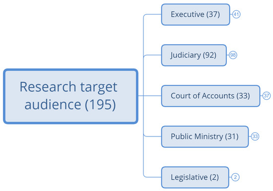 To answer the research questions, we conducted a literature review and a survey of Brazilian agencies. The survey was composed of 52 questions and addressed to all agencies of the Brazilian Public Administration. In total, there are 195 agencies, divided among the executive, judiciary, court of accounts, public ministry, and legislative branches, as shown in Figure 3. In addition, we contacted the 195 agencies through institutional e-mails. The questionnaire was applied between June 2021 and July 2021 and had 107 agencies (55% of the total), and the average response time was 12 min. Table 1 contains all questions that the agencies in the survey answered.