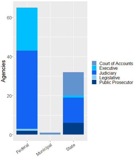 Among the 107 agencies that participated in the survey, 55 are part of the Judiciary. The Executive had 28, 14 from the Auditors’ Court, 8 from the Public Ministry, and 2 from the Legislative. Concerning the classification of the sphere of the body, 66 were from the Federal Public Administration, 38 were in the provincial level, and 3 were municipal, as presented in Figure 4.