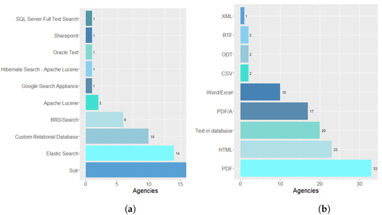 Thirty-six agencies stated that the developed system does not have a user’s manual, and twenty-one stated it does. Regarding the indexing engine used by the textual database processing system, 19 agencies reported that they use Solr, 14 agencies use Elastic Search, 10 agencies use a custom relational database, 6 agencies use BRS/Search, and 2 agencies use Apache Lucene. Figure 7a shows the databases: Google Search Appliance, Hibernate Search, Apache Lucene, Sharepoint by one agency, and SQL Server Full-Text Search only one agency uses them.