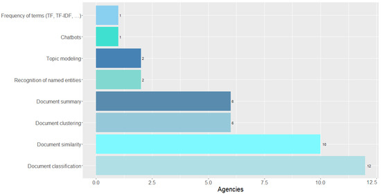 About text mining techniques the agency uses in the textual bases processing system, 12 agencies reported document classification, and ten agencies use document similarity. Six agencies reported that they use document clustering, and six agencies reported that they use document summary. 2 agencies reported that they use recognition of named entities and two agencies use topic modeling, one agency reported that it uses chatbots, 01 agency uses the frequency of teams, as presented in Figure 11.