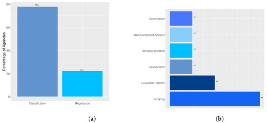 Concerning the supervised Machine Learning techniques used for text treatment, 70% of the agencies informed that they use the classification technique, 20% use the regression technique and 10% use the sequential patterns, as presented in Figure 12a. Forty agencies reported that they use the clustering technique as an unsupervised Machine Learning technique. Twenty agencies use sequential patterns. Besides, ten agencies use deviation detection, ten agencies principal component analysis, and ten agencies reported that they use vectorization (Figure 12b).