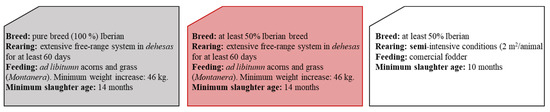 The management of the animals was in accordance with those defined for each commercial category by the current IQS [6], and are summarized in Figure 1. There is a fourth category contemplated by the IQS Green commercial category- which was not included in the experimental design of the current study owing to the large variability resulting from involving animals under different production system conditions (various percentages of Iberian breed, open-air reared and fed on fodder but without detriment that they may also be fed on acorns and grass in the Montanera system) [6].