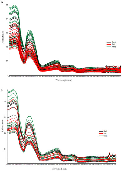 Raw spectra (reflectance) from calibration (A) and validation (B) sample set obtained from unopened pre-sliced MAP packaged Iberian Chorizo manufactured from raw material belonging to three official commercial categories (Black, Red and White).