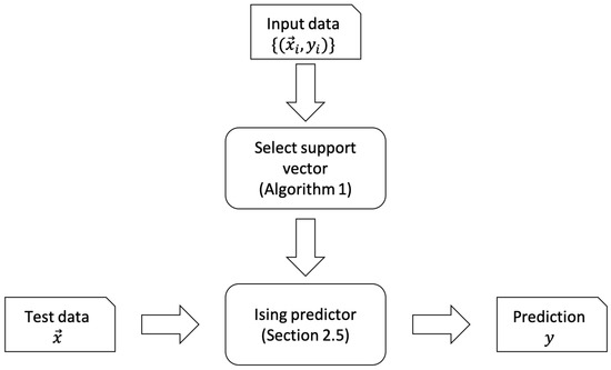 Outline of the proposed algorithm. The training data set is fed into the support vector selection algorithm. The support vectors are then used in the Ising predictor for prediction. The support vector selection algorithm is described in Algorithm 1 and the Ising predictor is described in Section 2.5.