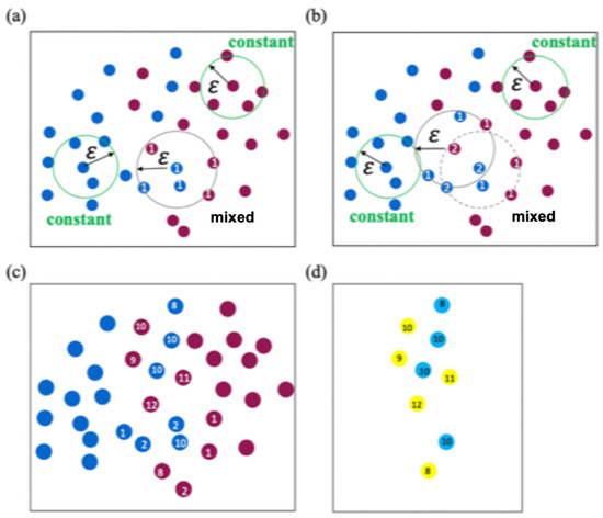 The training process. The red dots and blue dots are training data with two different classification labels. (a) For each data point , we consider the hypersphere of radius centered in the data point . We ask the question of whether all the data points in the sphere have the same label or not. (b) If the data within the sphere are mixed (not constant), then all the data within the sphere receive one count by . (c) After scanning through all the data, we rank the data according to . (d) The data points with the highest are selected as support vectors. The blue and yellow dots are support vectors for two different classes.
