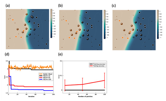 Support vector distribution, prediction probability and classification boundary from particle swarm optimization (PSO) results. The experimental parameters and optimal values are listed in Table 2. (a) . (b) . (c) . The small dots are the training data. The symbols bordered by white circles are the test data that were classified correctly. The crossed circles are the test data that were classified incorrectly. The large sphere symbols are the support vectors. (d) The learning curves for four experiments. The orange line is the Nelder–Mead experiment which does not converge. The other three lines are PSO results. The black line is , the red line is and the blue line is , respectively. (e) The training and testing accuracy suggest overfitting for larger values of N.