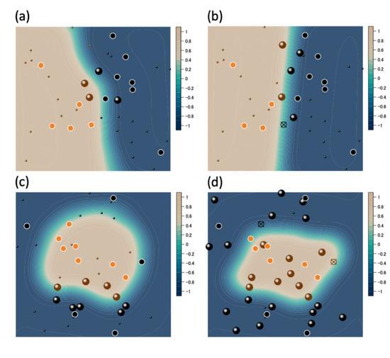 We demonstrate the classification task for two types of teacher data (linear classification boundary and non-linear classification boundary) using the proposed method. The learning of the optimal parameters was performed by minimizing the cost function. Since the parameters are associated with discrete ranking, we chose gradient-free optimization instead of gradient-based optimization. We implemented the Nelder–Mead method and particle swarm optimization (PSO) algorithms. We observed that PSO generally gives better results; hence, we focused on the results obtained by PSO. The hyperparameter N is the number of particles for PSO. The learned support vectors, classification boundary and learning curves for are depicted in Figure 6. The learned parameters are shown in Table 2. In all the cases, the total number of support vectors was fixed at , where five of them belonged to and the other five belonged to . The and the parameters were fixed to and . The optimization was performed by minimizing the loss function Equation (3) for the optimal values of . We observed that the classification could be performed in all experiments. We also observed that, for larger values of N, the optimized loss function had a lower value, but the test accuracy was also lower. This suggests possible overfitting for large values of N in PSO optimization.