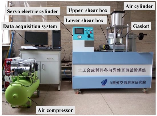 An interface shear test apparatus that can apply shear loading in different directions was developed to investigate the anisotropic shear strength behavior of soil–geogrid interfaces in this study. As shown in Figure 2, the anisotropic shear test apparatus consists of a mechanical system, pneumatic system, and electrical control system. The lower shear box has a diameter of 300 mm and a height of 150 mm, and the upper shear box has a diameter of 200 mm and a height of 100 mm. The lower box, which is of larger size, can ensure a constant interface contact area during shearing. Shear displacement would develop along the interface during shearing of the soil–geogrid interface. The gasket between the upper and lower shear boxes ensures that there is no friction between the geogrid specimen and the upper shear box. This apparatus can accommodate circular specimens to ensure consistent shear stress distribution for loading in different directions.
