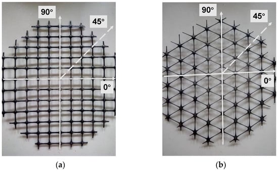 All the biaxial geogrids (SS20, SS30 and SS40) and triaxial geogrids (TX150, TX160 and TX170) were cut into nearly circular specimens with a diameter of 300 mm. Soil was first compacted in the lower shear box, and then the geogrid specimen and gasket were fixed on the lower box in sequence. The upper shear box was then installed on the gasket and filled with soil. The shear displacement was set as 33 mm for the 200 mm diameter upper box to reach a shear strain of 16.5% for the shear plane length. The specimen dimensions were slightly larger than the shear box for the convenience of fixing the geogrid on the shear box. The geogrid was fixed at the elevation of the shear plane and remained fixed during shearing, and the contact area between the geogrid and soil of each test was the same for different shear directions. Direct shear tests on soil–geogrid interfaces were conducted with the shear loading applied horizontally on the lower box at a constant rate of 1 mm/min in the directions of 0°, 45° and 90° (direction indicated in Figure 3), respectively. For each geogrid and shear direction, a series of interface shear tests were performed under the normal stresses of 50 kPa, 100 kPa, 150 kPa and 200 kPa to obtain the failure envelope.