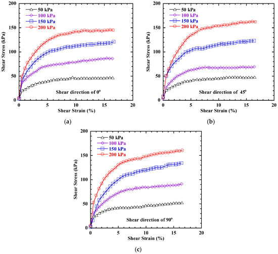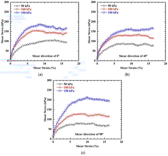 Shear stress–strain curves for gravel–triaxial geogrid (TX150) interfaces. (a) Shear direction of 0°, (b) shear direction of 45°, (c) shear direction of 90°.