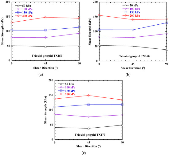 Although the three biaxial geogrids have different tensile strengths (e.g., 26.29 kN/m for SS20, 33.97 kN/m for SS30, and 48.26 kN/m for SS40 under shear direction of 0°), as indicated in Table 1, the interface shear strengths between the soil and the three biaxial geogrids are not much different; for example, the shear strength values are approximately 50 kPa for the three soil–biaxial geogrid interfaces under the normal stress of 50 kPa. This confirms that the soil–geogrid interface shear strength mainly depends on the shear strength of the soil itself, rather than the tensile strength of the geogrid. A similar trend is also observed in triaxial geogrids, as shown in Figure 8. In addition, the shear strength values for soil–triaxial geogrid interfaces are also close to those for soil–biaxial geogrid interfaces under the same normal stress. This indicates that the shear strength of soil–geogrid interfaces is not significantly affected by the type of geogrid.