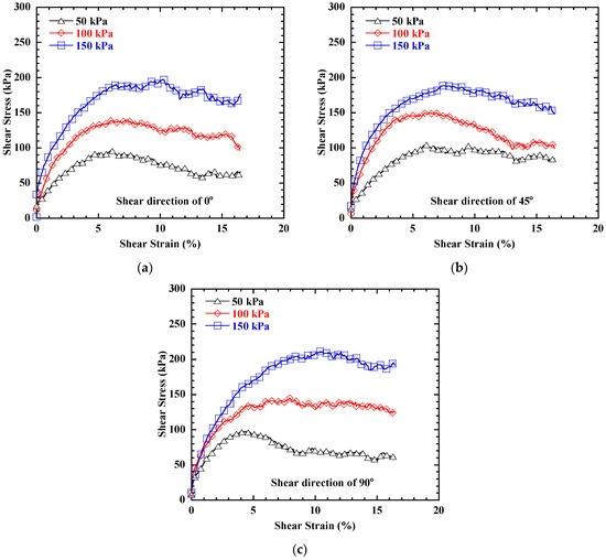 The results for coarse sand and gravel are presented to evaluate the influence of particle size on the anisotropic shear strength behavior of soil–geogrid interfaces. For the coarse sand, taking the biaxial geogrid SS40 and the triaxial geogrid TX150 as examples, the interface shear test results of coarse sand in different shear directions are shown in Figure 9 and Figure 10, respectively. The shear stress–shear strain curves of the coarse sand–biaxial geogrid (SS40) interface and the coarse sand–triaxial geogrid (TX150) interface both show that the shear stress remains stable, or has slight strain softening, after reaching the peak values, and that the strain softening behavior becomes more obvious with the increase in normal stress. However, the strain softening behavior of the shear stress–shear strain curves of the coarse sand–triaxial geogrid (TX150) interface is not as obvious as that of the coarse sand–biaxial geogrid (SS40).