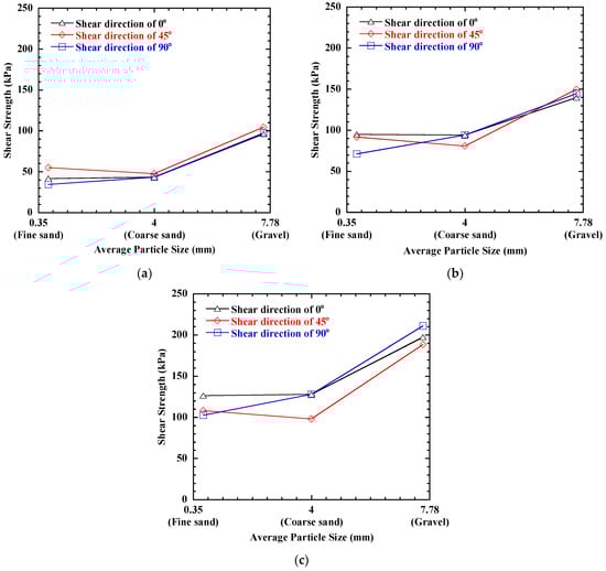 The influence of particle size on the shear strength of soil–triaxial geogrid (TX150) interfaces. (a) Normal stress of 50 kPa, (b) normal stress of 100 kPa, (c) normal stress of 150 kPa.
