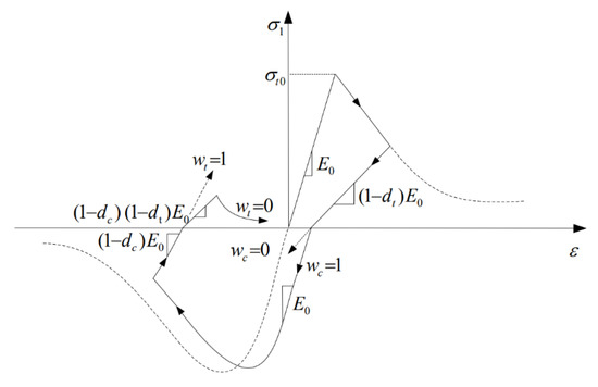 where and are the weighting factors of stiffness recovery related to the material properties. Figure 1 shows the stiffness recovery curve of the concrete damage model when the weighting factors are (compression → tension) and (tension → compression) under uniaxial alternating loads.