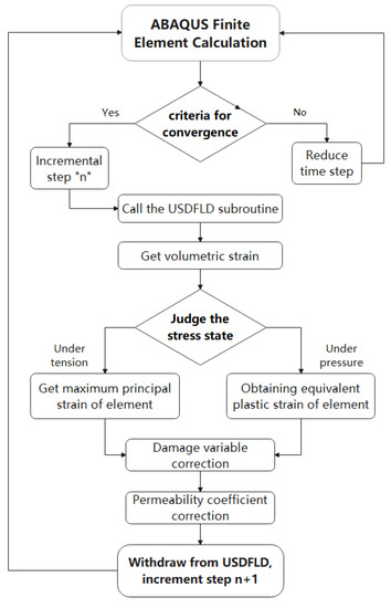 The SSD coupling method used in this paper is based on the ABAQUS finite element software for secondary development [39]. The SSD coupling method used in this paper is based on the ABAQUS finite element software for secondary development. The damage was obtained via the FORTRAN language program, namely GETBRM. According to the damage curve and the permeability coefficient, the subprogram USDFLD (ABAQUS subprogram, which can define the constant variable on the material point as a time function) is used to update the canal permeability coefficient with damage changes. The element’s permeability coefficient is defined as a field variable, and the subprogram was utilized in each incremental calculation to obtain the maximum principal strain and the equivalent plastic strain of the material integration point, thereby determining the element’s stress state. The element’s damage variable was solved. The lining’s permeability coefficient was revised based on relevant information of the element and node to predict the long-term operation of the SNWDP more accurately. The established SSD coupling analysis process is shown in Figure 2.