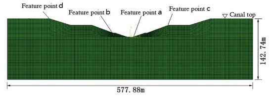 In the calculation process, the design water level of the canal, the highest groundwater level of the slope and underground drainage measures are not applicable. The anti-seepage system is damaged, the seepage of the slope is stable, and the interior slope has no boundary flow. Based on the finite element model of the specific cross-section of the deep excavated canal, the characteristic points a, b, c, and d respectively were selected for settlement analysis at the canal bottom, embankment, slope, and top. The water level adopted the canal’s design water level, the vehicle load on the first-level bridleway adopted the car-10 level load, the crowd load was 0.3 t/m2, and the highest groundwater level was 180.218 m.