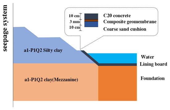 Three monitoring points, A, B, and C, were selected in the deep excavated canal to monitor the canal’s displacement and settlement. The clay materials are mainly used for the foundation and slope of the deep excavated canal section of the SNWDP. The anti-seepage system is mainly achieved by a concrete lining board, geomembrane, coarse sand cushion, and polysulfide sealant, as shown in Figure 5. During the actual operation of the SNWDP, the canal’s infiltrated surface is subject to the continuous change of the permeability coefficient. Therefore, in this study, the characteristics of the water section were constantly assumed to ensure the continuity and accuracy of the results.