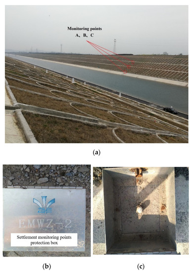 Canal of the South-to-North Water Diversion Project and settlement monitoring points. (a) A section of the South-to-North Water Diversion Project, (b) Settlement monitoring points protection box, (c) Settlement monitoring points.