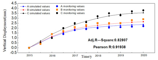 Three monitoring points, A, B, and C, were selected on the canal, bottom, and slope, respectively (as shown in Figure 6a). Their safety-monitoring data from January 2014 to January 2018 were calculated and analyzed. Settlement monitoring points were used to conduct on-site surveys of the settlement displacement of the deep excavated section of the SNWDP (Figure 6b,c). The calculation results were compared and analyzed. Figure 7 shows the correlation curve between the simulated settlement and the monitored settlement of the monitoring points.