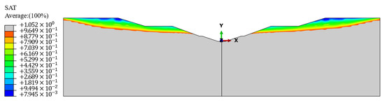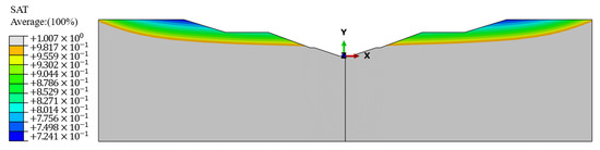 Figure 8 and Figure 9 respectively show the saturation contours of the deep excavated canal after 10 and 20 years of operation. Here, the saturation is used to describe the moisture content of the foundation soil under the concrete lining plate. It can be seen from the figures that in the deep excavated canal, most of the soil is in a saturated state, and some are unsaturated, and the seepage effect is relatively large. By comparing the two contours, it can be seen that under given conditions, as the operating time of the canal increases, the saturated zone decreases and the unsaturated zone increases. It may be due to the fluctuation in the void ratio and the permeability coefficient produced by canal settlement. With the continuous settlement of the canal, the void ratio decreases, and the coefficient of permeability also decreases. In the macroscopic view, a change in the seepage field generates a change in the stress field, which shows a change in the settlement.