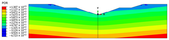 Figure 10 and Figure 11 respectively show the pore pressure contours of the deep excavated canal after ten years and 20 years of operation. It can be seen from the figures that there is negative pore pressure at the top of the canal, indicating the existence of unsaturated zones. The foundation exhibits both saturated seepage and unsaturated seepage, which is consistent with the numerical results of saturation. Pore pressure decreases on both sides towards the middle. Due to the high groundwater level on both sides of the deep excavated canal, the groundwater flows into the canal center under the action of gravity. Therefore, drainage measures should be taken on the slope of the canal to reduce the groundwater seepage and improve the security of the canal water supply.