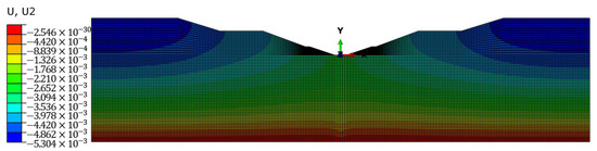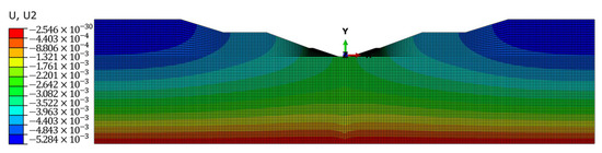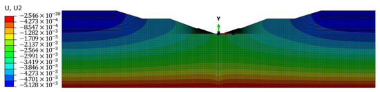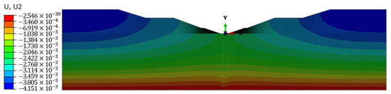 The numerical simulation is repeated to investigate the deep excavated canal’s long-term settlement and deformation to get the nephogram of canal settlements after 20 years of operation, as shown in Figure 16. It is evident from the figure that the maximum settlement is very close to that calculated after 10 years of operation, indicating the deep excavated canal has reached a stable state, as shown in Figure 17. However, in actual operation, the stability of the deep excavated canal is affected by many factors such as complex water distribution conditions and varying environments, and significant settlements can occur locally. As the operating time increases, the canal’s settlement becomes smaller, not affecting its operating safety.