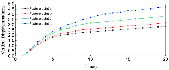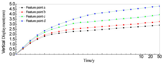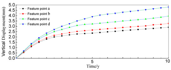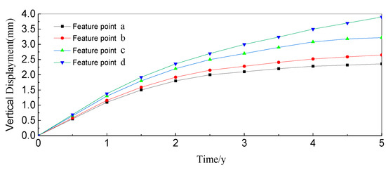 Based on the foregoing conclusions, a numerical simulation of the deep excavated canal is carried out, and a nephogram of the canal’s settling clouds after ten years of operation is obtained (see Figure 14). According to the nephogram of canal settlements, the settlement curve of each characteristic point was obtained (as shown in Figure 15). It can be seen from the figures that the maximum settlement is 5.128 mm, which represents an increase of 0.977 mm compared to the five years of operation. This change is not significant, so it is believed that the settlement has reached the final settlement. Table 1 shows the settlement rate of the canal top’s characteristic point at different times after the 10-year operation. The canal subsides at a decreasing rate after its operation. After 10 years of operation, the canal settlement rate is 0.16 mm/year. Although its absolute number is minimal and may not have much impact, the settlement continues.