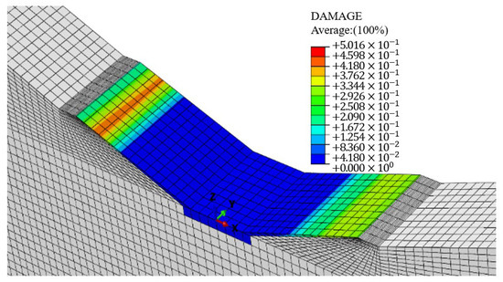 After 50 years of operation, the canal was discovered to be slightly damaged when investigating the evolution of its long-term behavior (Figure 20). In terms of overall damage, the maximum damage to the canal lining after the long-term operation is 37.6%. It is predicted that the deep excavated canal in the SNWDP Xichuan Section can still be used under normal operating conditions, for there is no large-area damage, except the concrete damage near the water surface. The damage first appeared near the water level of the left lining plate because the elevation of the top of the canal on the left bank was higher than that on the right bank, and the seepage–stress coupling effect was greater. The damage then occurred on the right lining plate, particularly at the point of the overflow of the water table in the canal, which was symmetrical to the point of damage on the left bank. The high level of the water table and its increasing water pressure with depth are the main causes of damage to the canal lining board. The water pressure differential between the inside and outside of the canal lining board is significant. The water pressure difference between the top and lower positions of the water surface inside the canal is minor, resulting in damage. The canal lining board is generally in a relatively safe condition, and there is no large-scale damage. Over time, the lining board may eventually be damaged in the form of uplifting after 50 years of operation, which may provide theoretical indications for the actual operation of the project. This study used the SSD coupling method to predict the service life and running status of the deep excavated canal in the SNWDP Xichuan Section under normal conditions, but it was limited to such external factors as environment, climate, and rainfall intensity [40]. More other influencing factors need to be studied further.