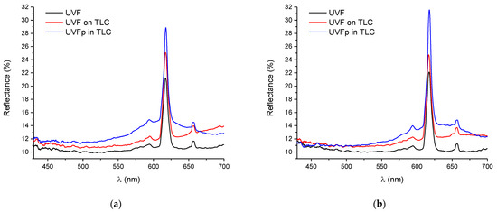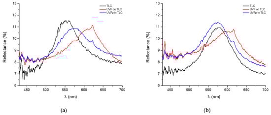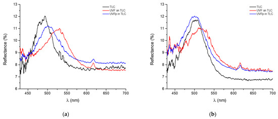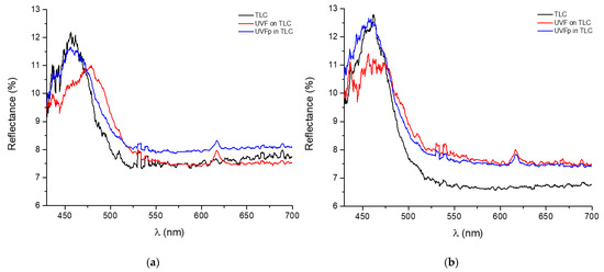 Spectral reflectance of UVF ink and hybrid ink systems showed that TLC ink does not cause any changes in the reflectance spectra of the UVF printing ink. The highest spectral reflectance was measured on the UVFp in TLC prints compared to the other ink systems. It is concluded that used TLC ink is suitable for the combination with used UVF pigment in the proposed hybrid ink system.