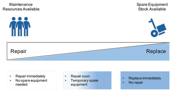 An actor managing the asset makes a decision by trading off resource constraints (Figure 3). The actor can trade off between two extremes: immediate maintenance—requiring available maintenance resources; or immediate replacement—requiring available spare equipment; or any point on the continuum between these. With the help of the process twin, the decision maker may judge whether there are spare equipment or maintenance resources available and at what cost and how to trade off the available resources among several equipment instances of the installed base.